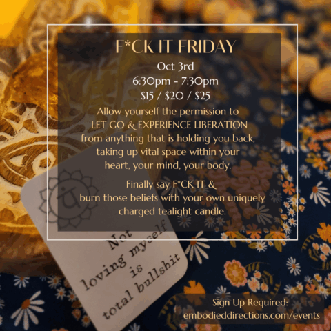 w/Jenn V Friday, October 3rd – 6:30 pm – 7:30 pm Tiered Pricing: $15 / $20 / $25 Through meditation, movement, and music, we’ll gather in a space of safety, […]