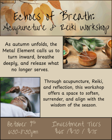 Friday, 10/21 from 6:30 – 8:30 pm Awaken Your True Self with Sonic Neural Breathwork 🌀🌿 Join us for an evening of gentle stretch, seated and laying down somatic movement […]